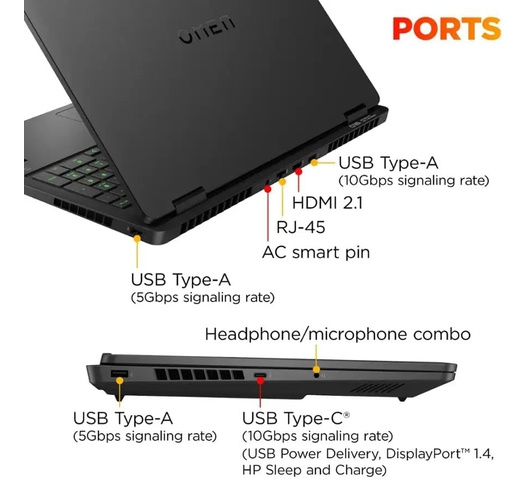 Connection & Ports Intel AX211 Wi-Fi 6E (2x2) Bluetooth 5.3,1x USB-C 3.2 Gen 2 (Power Delivery and DisplayPort 1.4 and Power-off Charging and 10Gbps), 1x USB 3.2 Gen 2 (10Gbps), 2x USB 3.2 Gen 1 (5Gbps), 1x RJ-45, 1x HDMI v2.1, 1x Headphone and microphone combo jack.1 x 32GB USB Drive included.