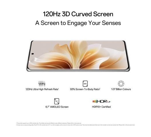 Display: 6.7-inch OLED screen with 120Hz refresh rate, 10-bit color, and up to 950 nits brightness.
